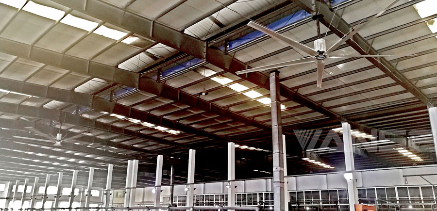 由于 HVLS 風(fēng)扇不斷混合從屋頂?shù)降匕宓目諝?,因此建筑物?nèi)部存在恒定的熱平衡狀態(tài)。這樣不會在屋頂梁或地板上形成冷凝水,從而消除產(chǎn)品或機(jī)械上的冷凝水滴落,并有助于確保地板保持干燥和安全。