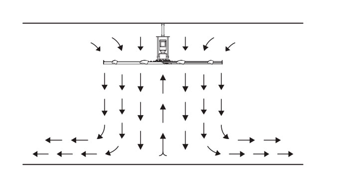 氣流從大型吊扇扇葉向地面吹動,當氣流撞擊地面時,它會向各個方向向外推送,往外不斷延伸,直至最大傳送距離或障礙物。