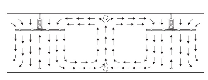 當有多個適當間隔的大型吊扇時,相鄰的氣流流相遇形成壓力區(qū)。壓力區(qū)就像一堵墻,使得每個吊扇都像一個封閉的風扇。通常,當一臺吊扇與其他風扇一起工作時,它的性能會提高。